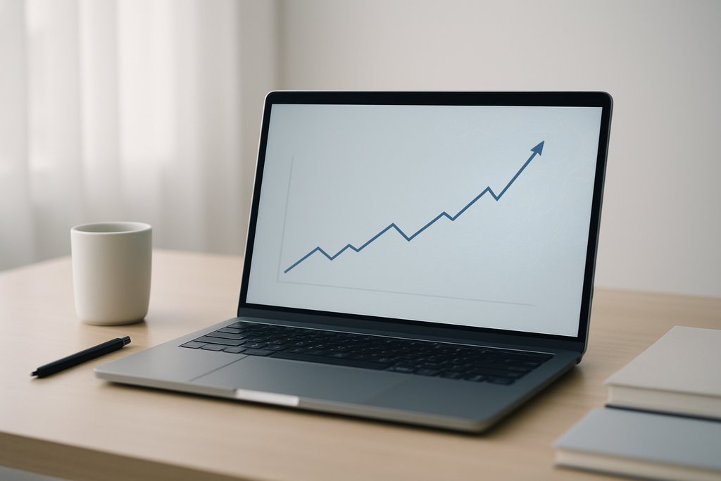 Clean, photo-realistic scene of a minimalist investor’s desk: a sleek open laptop on a light wood surface displays a simple upward-trending line chart with no numbers or labels, while a subtle translucent AI circuit pattern softly glows across part of the screen to suggest machine learning analysis.