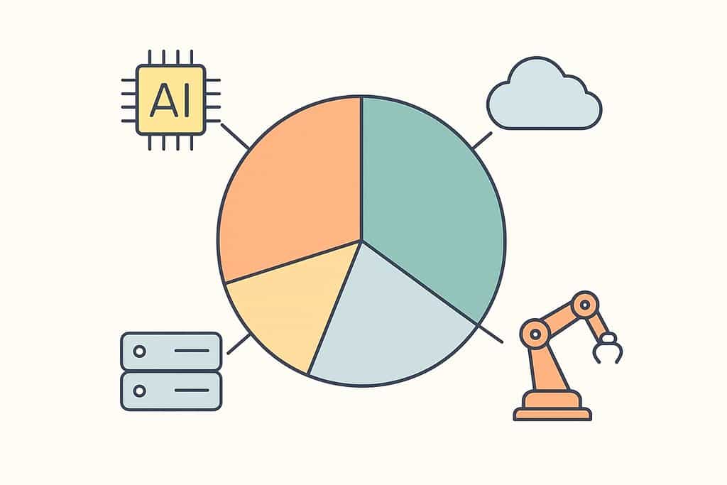 Simple, flat vector illustration showing diversified AI-related investing: a clean pie chart with three to five segments (no labels or numbers) surrounded by a few minimal icons representing the AI ecosystem—semiconductor chip, cloud, robotic arm, data server—each connected to the pie by thin lines.