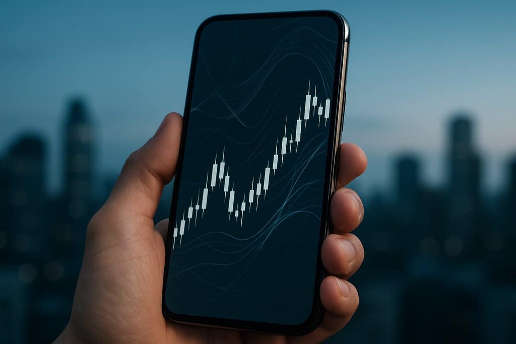 Close-up, photo-realistic image of a hand holding a smartphone displaying a clean candlestick chart with no axis labels or numbers, overlaid with faint, flowing algorithmic lines to imply AI signals.